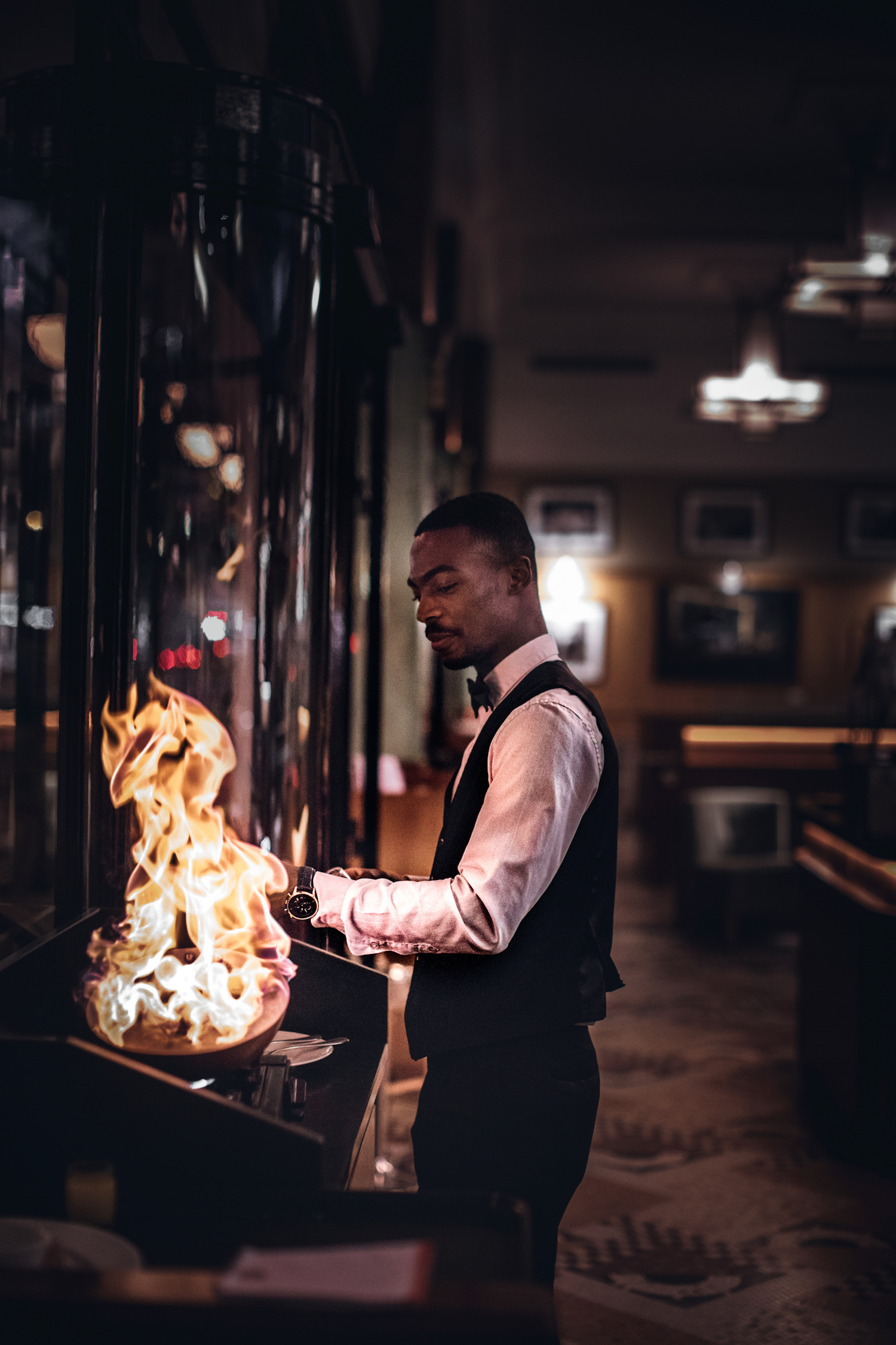 A server preparing Crepes Suzette flambéed in Grand Marnier at La Coupole. A famed pre war Brasserie in the Montparnasse area since 1927 and a frequent watering hole for the late Ernest Hemingway.