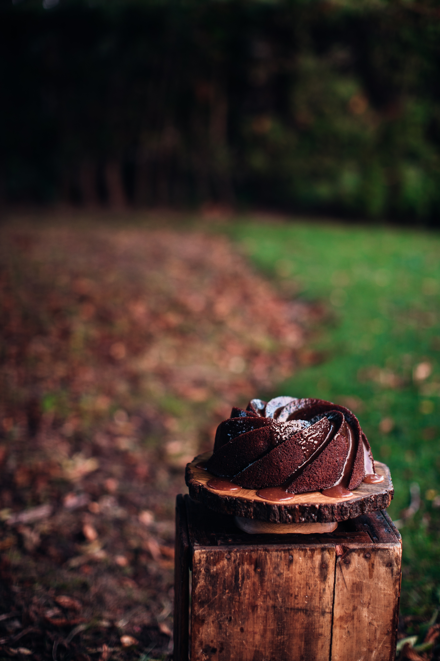 23. Remove from stove top and add the spiced rum and salt. Allow the caramel to cool in fridge for 15 minutes or so or at room temperature for an hour before drizzling half the caramel over the cooled cake.