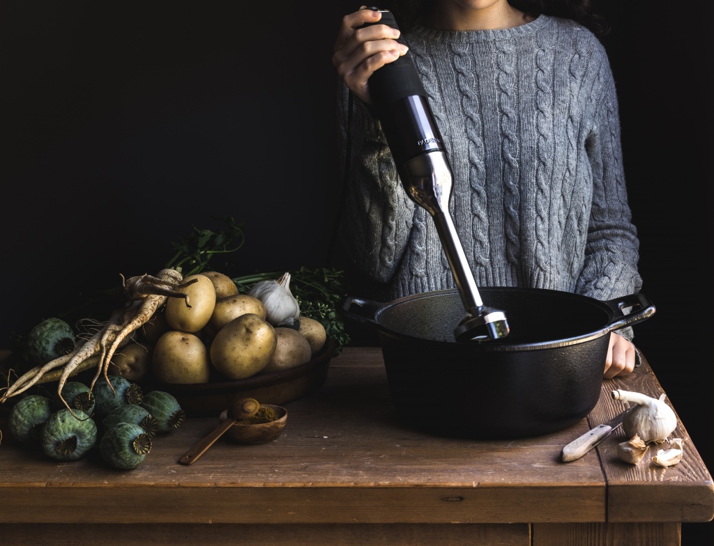 - Roughly chop the peeled washed potatoes, parsnips and garlic in your Paderno Variable Speed Immersion Blender into large chunks.