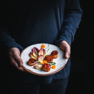 Gochujang White Wine Nova Scotian Scallops. Made with Nobilo Sauvignon Blanc & MSC Scallops with Raddichio and Mandarin